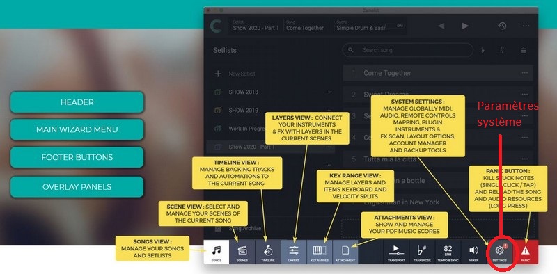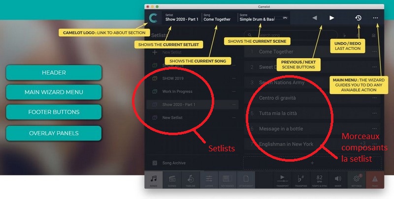 Lors d’un concert ou d’une prestation en public vous allez jouer un ensemble de morceaux que vous allez enchainer dans un ordre préétabli, mais vous devez aussi avoir la possibilité, si nécessaire, de modifier cet ordre de manière simple à tout moment, c’est ce que l’on appelle la « Setlist » (le répertoire) dans CAMELOT. En fonction de la nature des concerts il est possible de créer plusieurs « Setlist » (dans l’exemple ci-dessous … Show 2019, Work In Progress, Show 2020 Part 1 sont des « setlist » la liste des morceaux de cette dernière étant affichée sur la droite de l’écran). Les morceaux que composent cette « Setlist » peuvent être déplacés à tout moment par simple cliquer glisser (difficile de faire plus simple).
