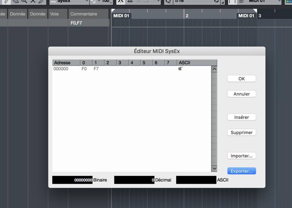 Il faut ensuite créer un fichier Midifile contenant le SysEx voici comment faire dans Cubase mais cela doit être identique dans d’autres STAN